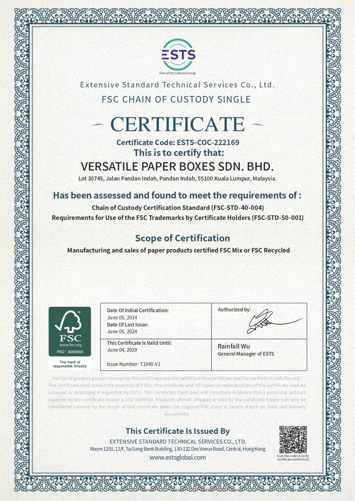 We are one of the country’s leading manufacturers of paper and cardboard packaging products, and the first company to acquire the German-made Heidelberg Speedmaster CD 5-colour offset printing machine complete with computerised quality and register control system. We specialise in the production of offset printed cartons; laminated, corrugated, and die-cut boxes. VPB serves various clients from different industries such as Ansell, SKF, WRP, and QSR, and will continue to grow and gain quality standards throughout the industry. Versatile Paper Boxes Sdn. Bhd. is certified with ISO9001:2015, ISO14001:2015, FSSC 22000 V6 and FSC CoC. Versatile Paper Boxes Sdn. Bhd. is also a member of SEDEX and UL.